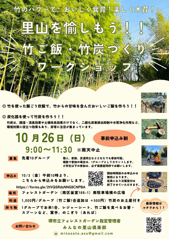 ・持ち物:1グループでお米1合、レジャーシート、竹ご飯を食べるお箸・スプーンなど、軍手、のこぎり(あれば)